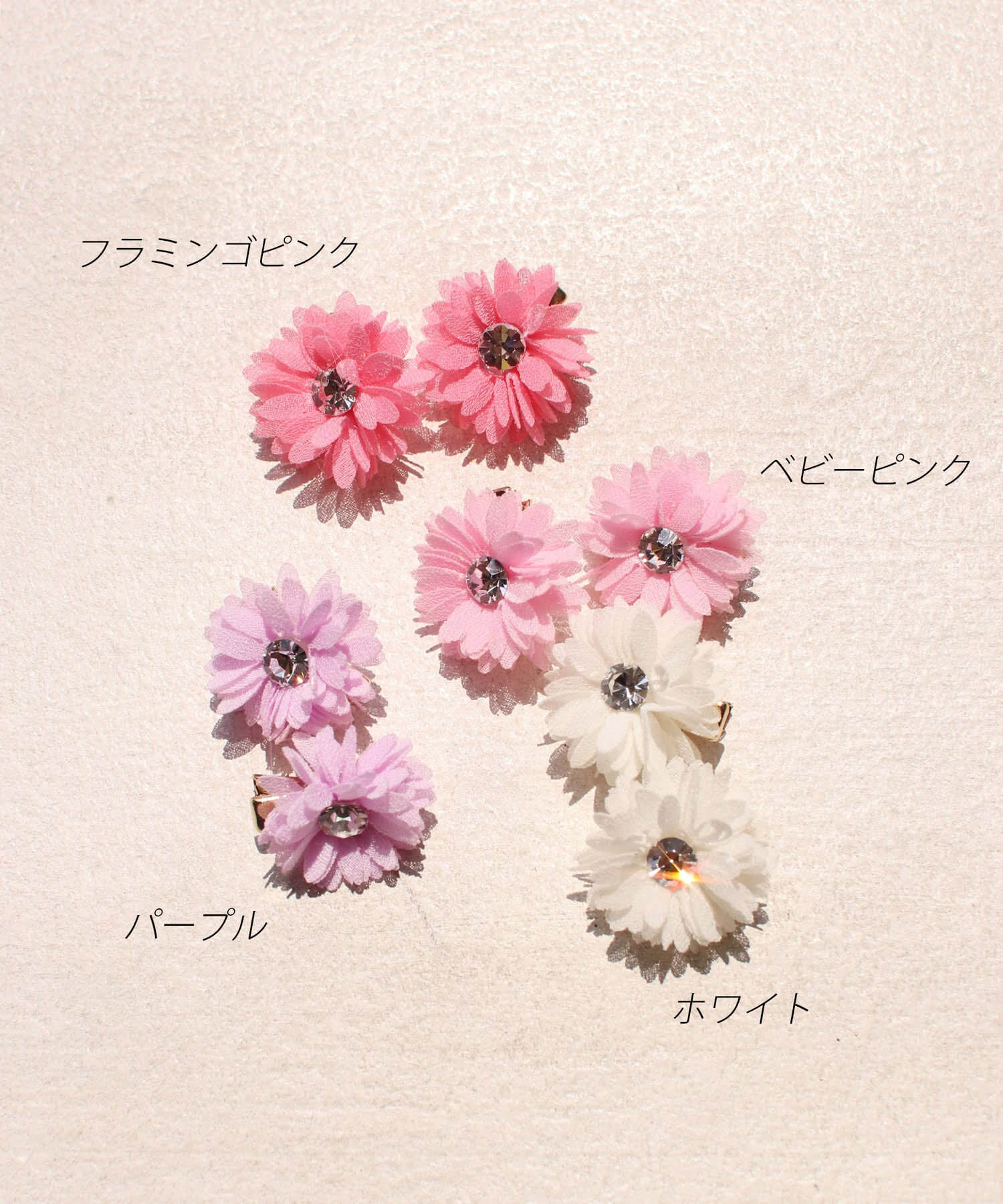 ヘアクリップとカチューシャはパープル、ピンク、ホワイトの3カラー